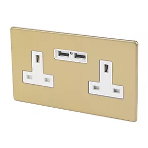 Brushed brass socket for a sleek, contemporary style. Removable, screwless faceplate for easy decoration and a flawless finish. Left USB port optimised for Apple products, right USB port optimised for non-Apple products. Ideal for charging iPads, iPhones, tablets, mobiles and cameras. Concealed fixings.