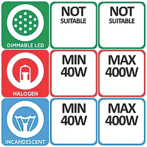 | Advisory Notice | Not suitable for dimmable LED lighting, non-dimmable fluorescent bulbs or tubes, wirewound or torodial transformers, fans or motors. |